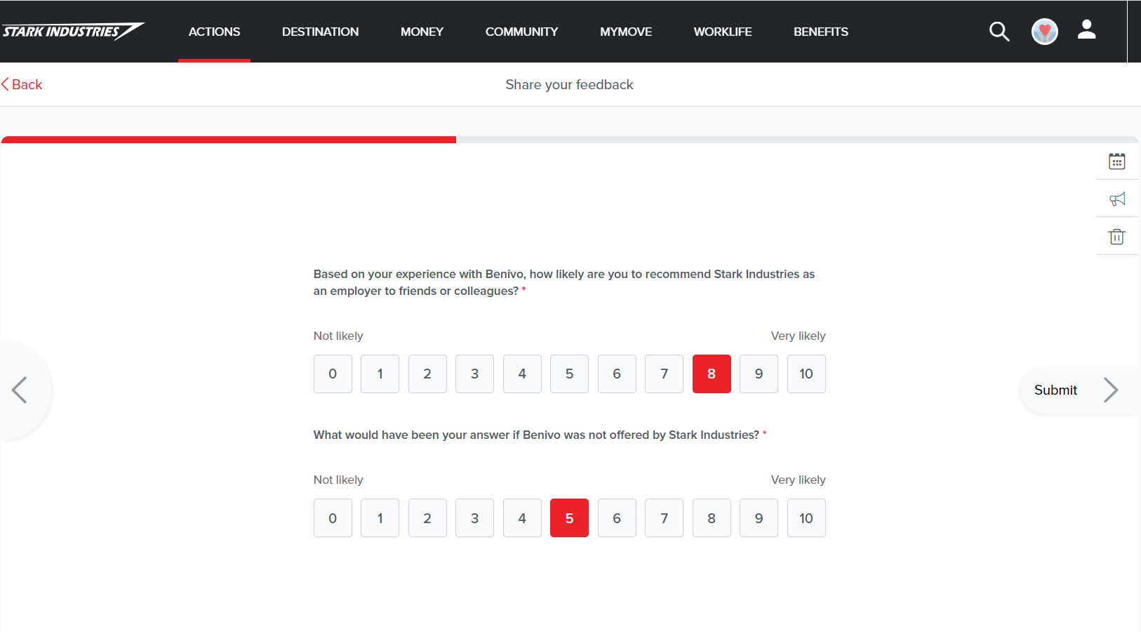 Benivo asks employees for feedback across a range of areas to ensure we're delivering the best service possible. Our team follows up with all employees that provide a feedback score of 6 or less. This customer development exercise allows us to focus iterations on what matters most. Scores and notes from all interactions are available to view in real-time on the Management Platform via the ‘Benivo Feedback’ report.